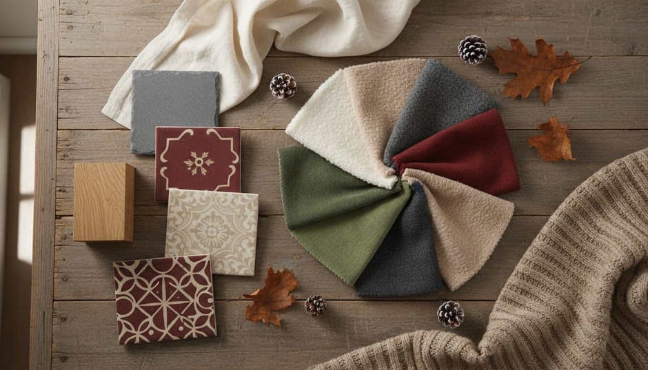 Flat lay με δείγματα υφασμάτων, ξύλο, πέτρα, κεραμικό και κουκουνάρια σε γήινες χειμωνιάτικες αποχρώσεις για ρουστίκ διακόσμηση εσωτερικού χώρου για τον χειμώνα.