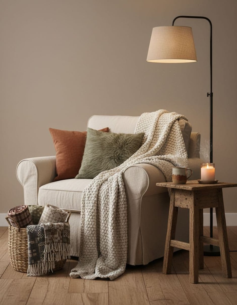 Ρουστίκ χειμωνιάτικη γωνιά ανάγνωσης με πολυθρόνα, πλεκτή κουβέρτα, ξύλινο τραπεζάκι, λάμπα και καλάθι με κουβέρτες.
