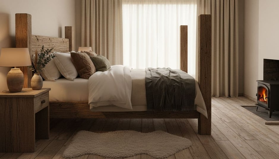 Ζεστή ρουστίκ χειμωνιάτικη κρεβατοκάμαρα με ξύλινο κρεβάτι, στρώσεις από σεντόνια και κουβέρτες και ξύλινο κομοδίνο με λάμπα και αποξηραμένα λουλούδια.